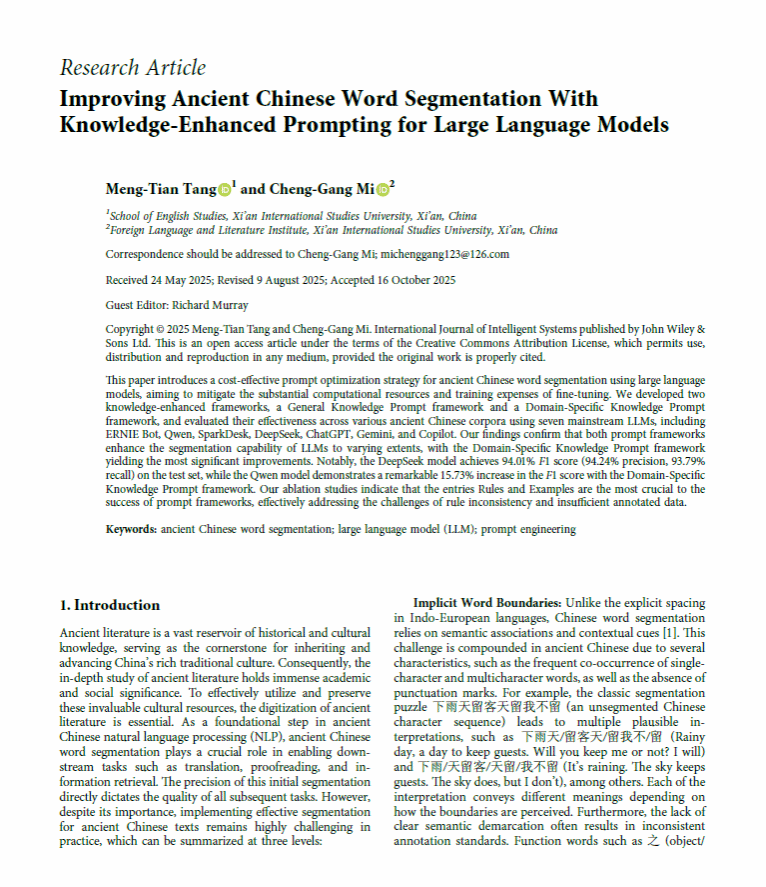 近日,研究院米成刚博士与英文学院本科生汤梦恬在国际学术期刊International Journal of Intelligent Systems上合作发表题为Improving Ancient Chinese Word Segmentation With Knowledge-Enhanced Prompting for Large Language Models的学术论文,米成刚博士为该论文的通讯作者。